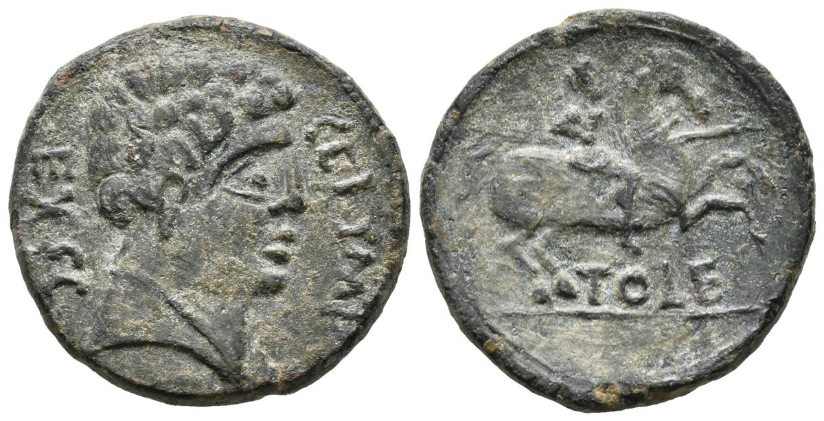 TOLE. As. 50-20 a.C. Toledo. A/ Cabeza masculina con collar a derecha, alrededor EX SC-CELTAMB. R/ Jinete lancero a derecha, debajo sobre línea leyenda TOLE. FAB-2401. Ae. 6,86g. Buen ejemplar. MBC+.