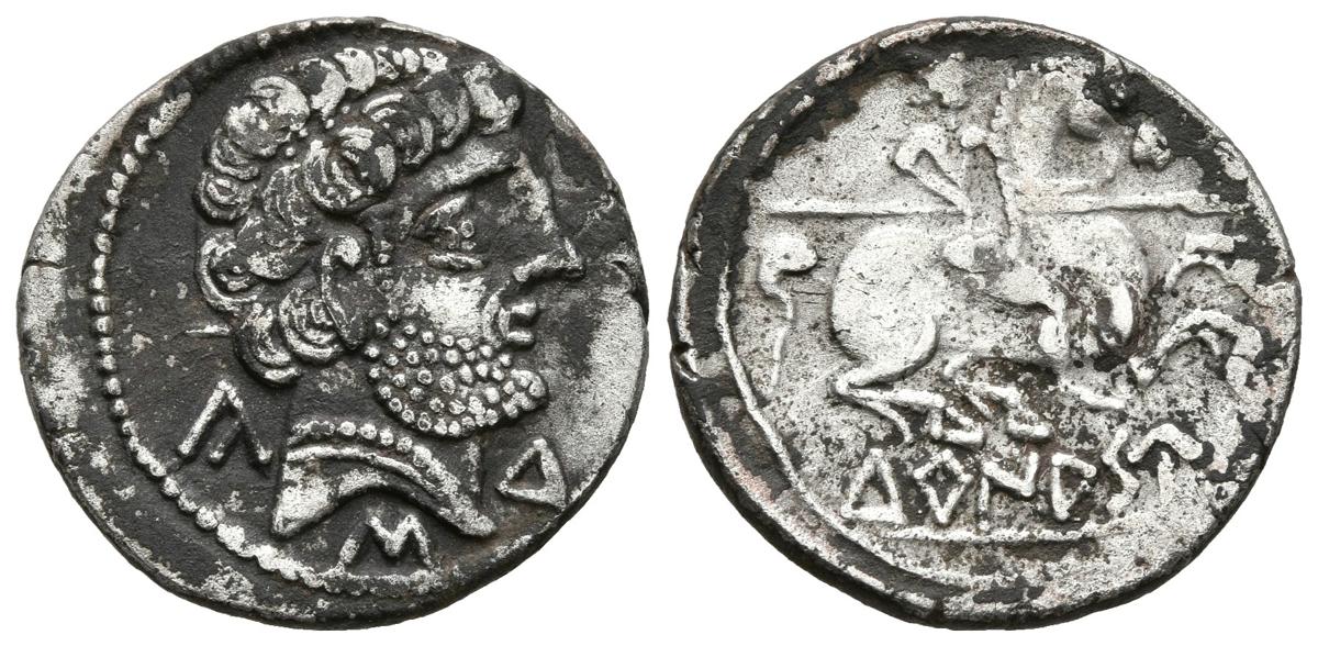 TURIASO. Denario. 120-80 a.C. Tarazona (Zaragoza). A/ Cabeza masculina a derecha con doble collar y letras ibéricas Ca.S.Tu. R/ Jinete con lanza a derecha, debajo TuRIASU. FAB-2417. Ar. 3,85g. Depósitos. MBC+/MBC.