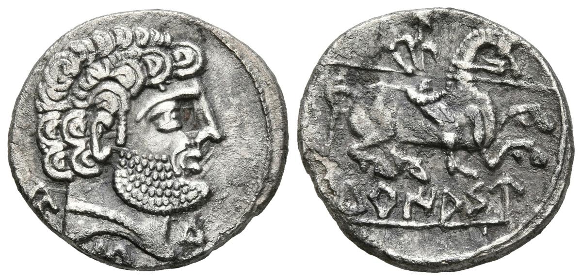 TURIASO. Denario. 120-80 a.C. Tarazona (Zaragoza). A/ Cabeza masculina a derecha con doble collar y letras ibéricas Ca.S.Tu. R/ Jinete con lanza a derecha, debajo TuRIASU. FAB-2417. Ar. 3,18g. Depósitos en reverso. MBC+/MBC.