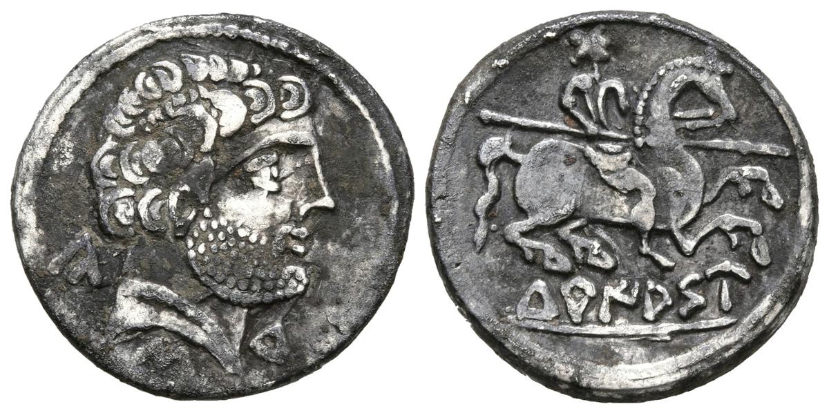 TURIASO. Denario. 120-80 a.C. Tarazona (Zaragoza). A/ Cabeza masculina a derecha con doble collar y letras ibéricas Ca.S.Tu. R/ Jinete con lanza a derecha, debajo TuRIASU. FAB-2417. Ar. 3,59g. Depósitos. MBC/MBC+.