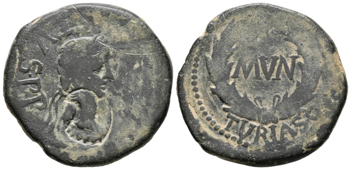 TURIASO. As. Epoca de Augusto. 27 a.C.-14 d.C. Tarazona (Zaragoza). A/ Cabeza con láurea de Augusto a derecha. IMP. AVGVSTVS. P. P. R/ Láurea, dentro MVN, debajo TVRIASO. FAB-2437. Ae. 12,60g. Contramarca de cabeza de jabalí en anverso. BC/BC+. Escasa.