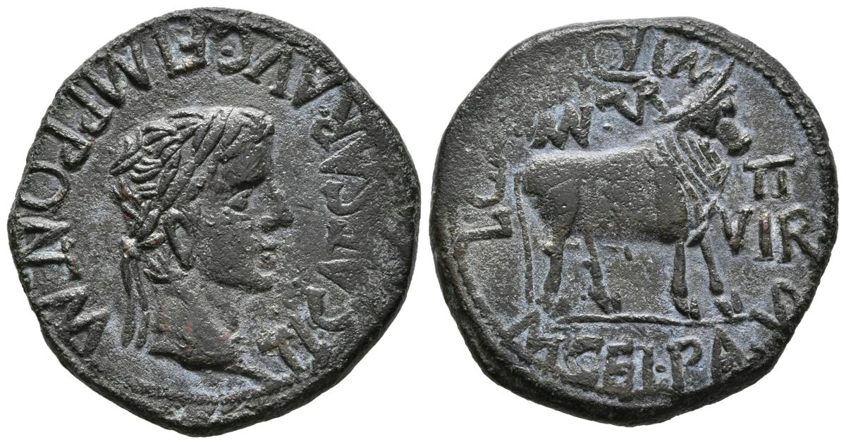 TURIASO. As. Epoca de Tiberio. 14-36 a.C. Tarazona (Zaragoza). A/ Cabeza con láurea de Augusto a derecha. TI.CAESAR.AVG.F.IMP.PONT.M. R/ Toro parado a derecha, encima MVN. TVR. delante II VIR. y alrededor L.CAEC.AQVIN.M.CEL.PALDV. FAB-2454. Ae. 11,50g. MBC+.