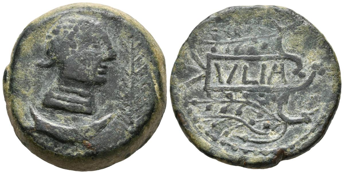 ULIA. As. 50 a.C. Montemayor (Córdoba). A/ Cabeza femenina a derecha, delante palma y debajo creciente. R/ Ramas de vid alrededor de cartela, VLIA. FAB-2490. Ae. 25,92g. MBC.