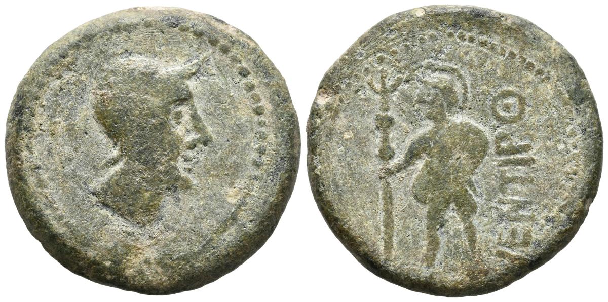 VENTIPO. As. 150-50 a.C. Casariche (Sevilla). A/ Cabeza con casco a derecha. R/ Soldado con escudo y lanza a izquierda, detrás vertical externa VENTIPO. FAB-2516. Ae. 21,22g. MBC-.