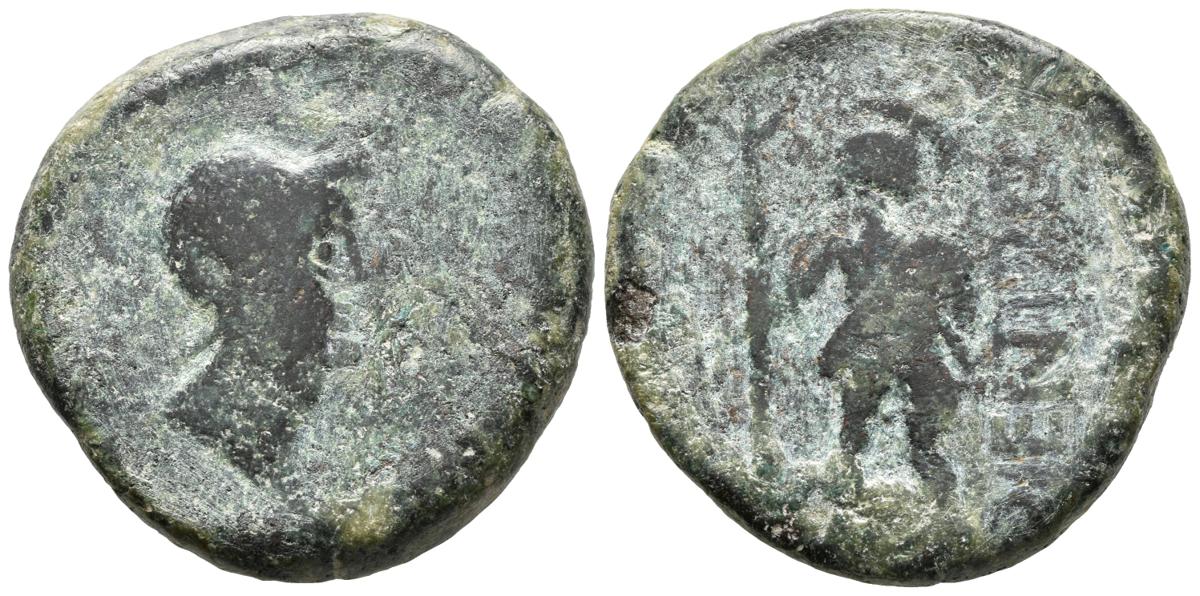 VENTIPO. As. 150-50 a.C. Casariche (Sevilla). A/ Cabeza con casco a derecha. R/ Soldado con escudo y lanza a izquierda, detrás vertical externa VENTIPO (letras NT unidas). FAB-2517. Ae. 24,12g. MBC-.
