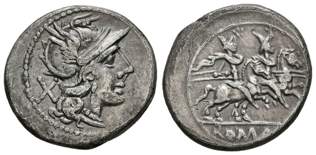ACUÑACIONES ANONIMAS. Denario. 211 a.C. Roma. A/ Busto de Roma a derecha, detrás signo de valor X. R/ Los Dióscuros cabalgando a derecha, en exergo ROMA dentro de cartela. Craw 53.2; Sydenham 229; RSC (Anonymous). Ar. 3,65g. MBC/MBC+.