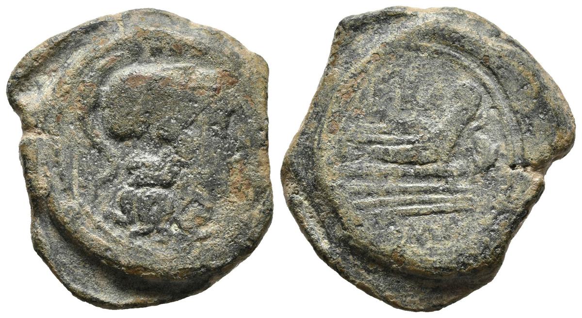 S. AFRANIUS. Triens. 150 a.C. Roma. A/ Cabeza de Minerva con casco a derecha, encima cuatro puntos. R/ Proa de nave a derecha, encima SAFRA, delante delfín. En exergo ROMA. Craw 206.4. Ae. 9,09g. BC/BC+.