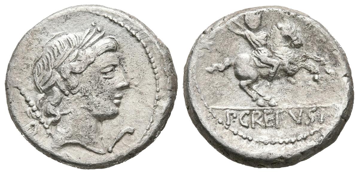 P. CREPUSIUS. Denario. 82 a.C. Roma. A/ Cabeza laureada de Apolo a derecha, detrás cetro y letra D, delante ¿strigilum?. R/ Jinete a derecha blandiendo lanza, en exergo P·CREPVSI. Craw 361.1. Ar. 4,18g. MBC.