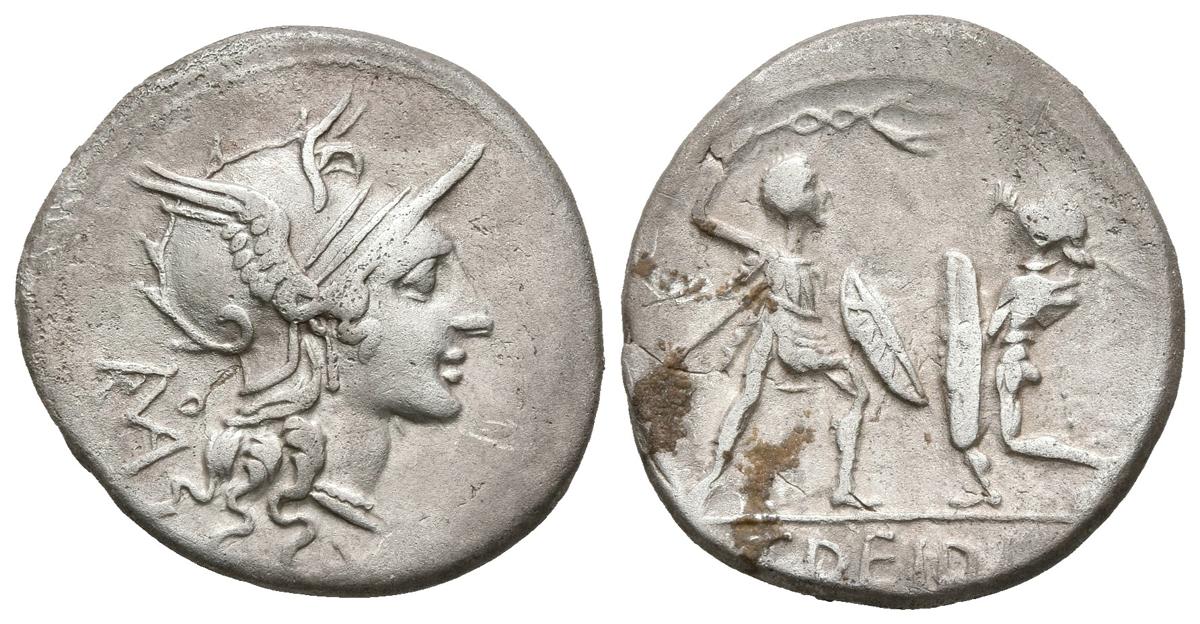 T. DIDIUS. Denario.113-112 a.C. Roma. R/ Cabeza con casco de Roma a derecha, debajo valor XVI, detrás monograma de ROMA. R/ Dos soldados luchando, uno atacando con un látigo, el otro defendiéndose con una espada, en exergo T·DEIDI. Didia 2; Crawford 294/1. Ar. 3,44g. MBC+.*Crawford sugiere que en el reverso representado en esta moneda se trata de la escena que se esperaría presenciar en los juegos que T. Didius prometió organizar durante su época de edil, siendo este un claro ejemplo de propaganda electoral.