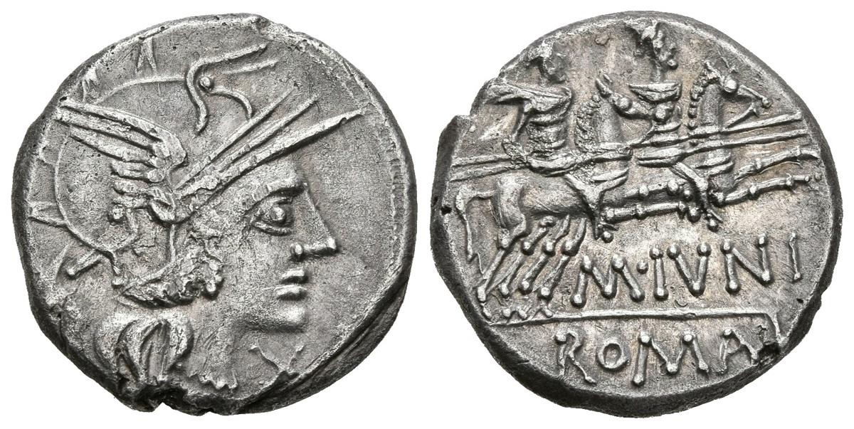 M. JUNIUS SILANUS. Denario. 145 a.C. Roma. A/ Cabeza de Roma a derecha, delante signo X, detrás cabeza de asno. R/ Los Dioscuros a caballo a derecha, debajo M·IVNI, en exergo ROMA. Babelon (Junia) 8; Craw 220.1, Syndeham 408. Ar. 3,67g. MBC+/EBC.