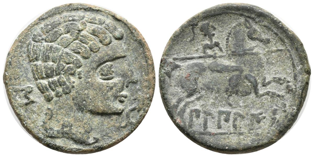 BILBILIS. As. 120-30 a.C. Calatayud (Zaragoza). A/ Cabeza masculina con manto y torques a derecha, delante delfín, detrás signo ibérico S. R/ Jinete con lanza a derecha sobre exergo leyenda ibérica BiLBiLIS. FAB-254. Ae. 11,42g. MBC+/MBC.