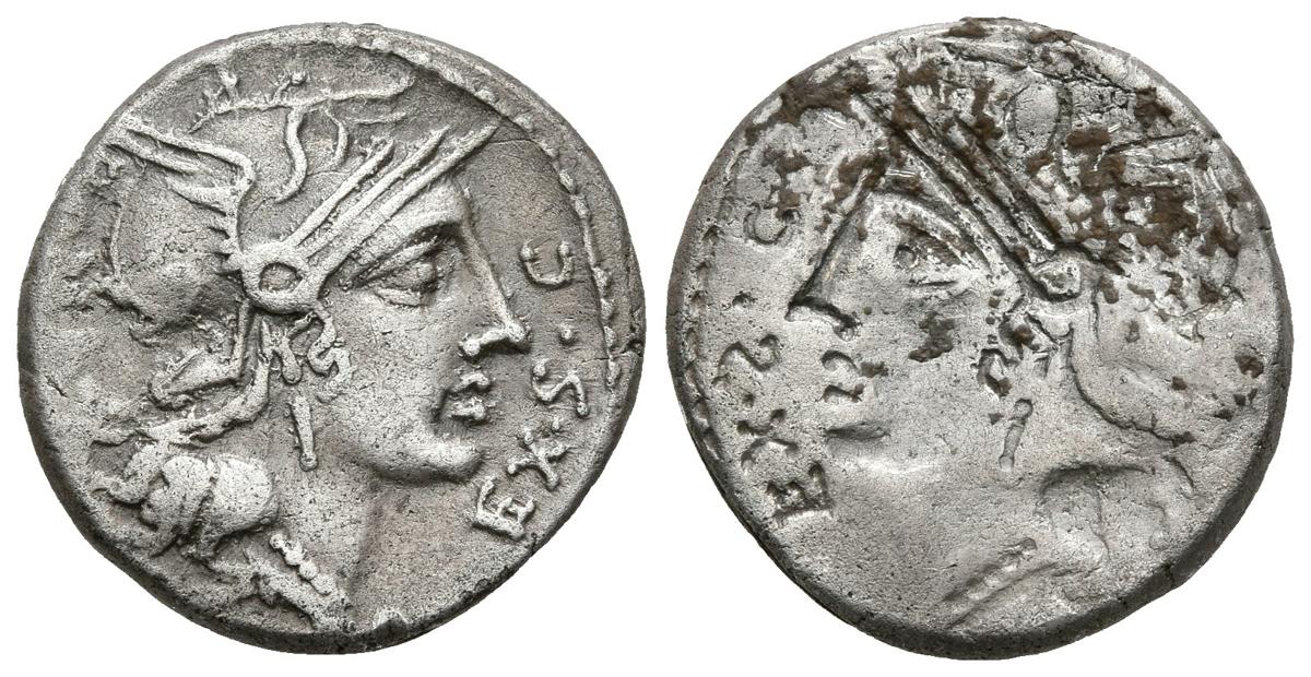 M. SERGIUS SILUS. Denario. 116-115 a.C. Roma. A/ Busto de Roma a derecha, detrás signo de valor ROMA EX S C. R/ Incuso. Craw 286.1; RSC Sergia 1. Ar. 3,83g. MBC+