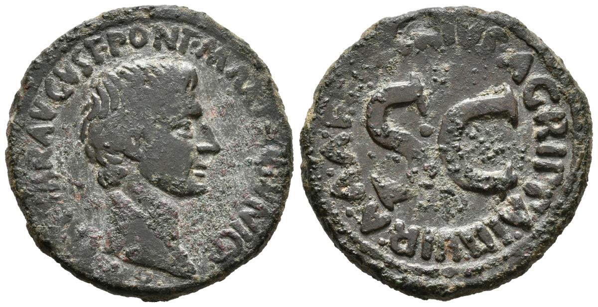 AUGUSTO, P. Lurius Agrippa. As. 7 a.C. Roma. A/ Busto a izquierda. CAESAR AVGVST PONT MAX TRIBVNIC POT. R/ S·C en el centro, alrededor leyenda interna P LVRIVS AGRIPPA IIIVIR AAAFF. RIC 427; BMC 214; Cohen 446. Ae. 12,04g. MBC-/MBC.