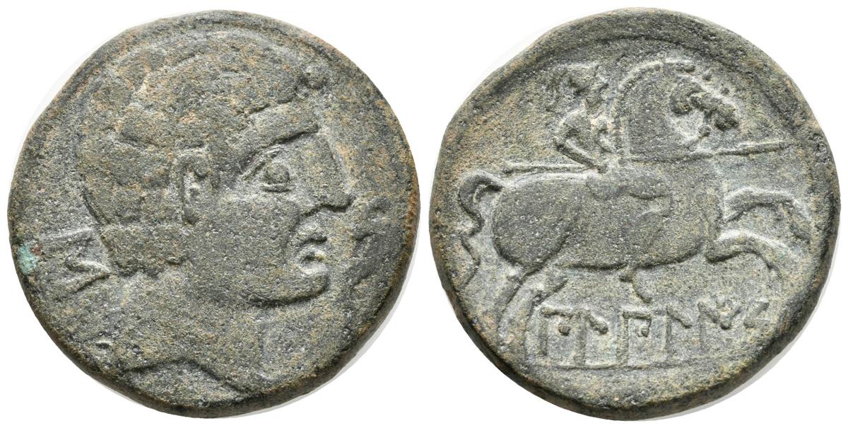 BILBILIS. As. 120-30 a.C. Calatayud (Zaragoza). A/ Cabeza masculina con manto y torques a derecha, delante delfín, detrás signo ibérico S. R/ Jinete con lanza a derecha sobre exergo leyenda ibérica BiLBiLIS. FAB-254. Ae. 14,34g. MBC-/MBC.