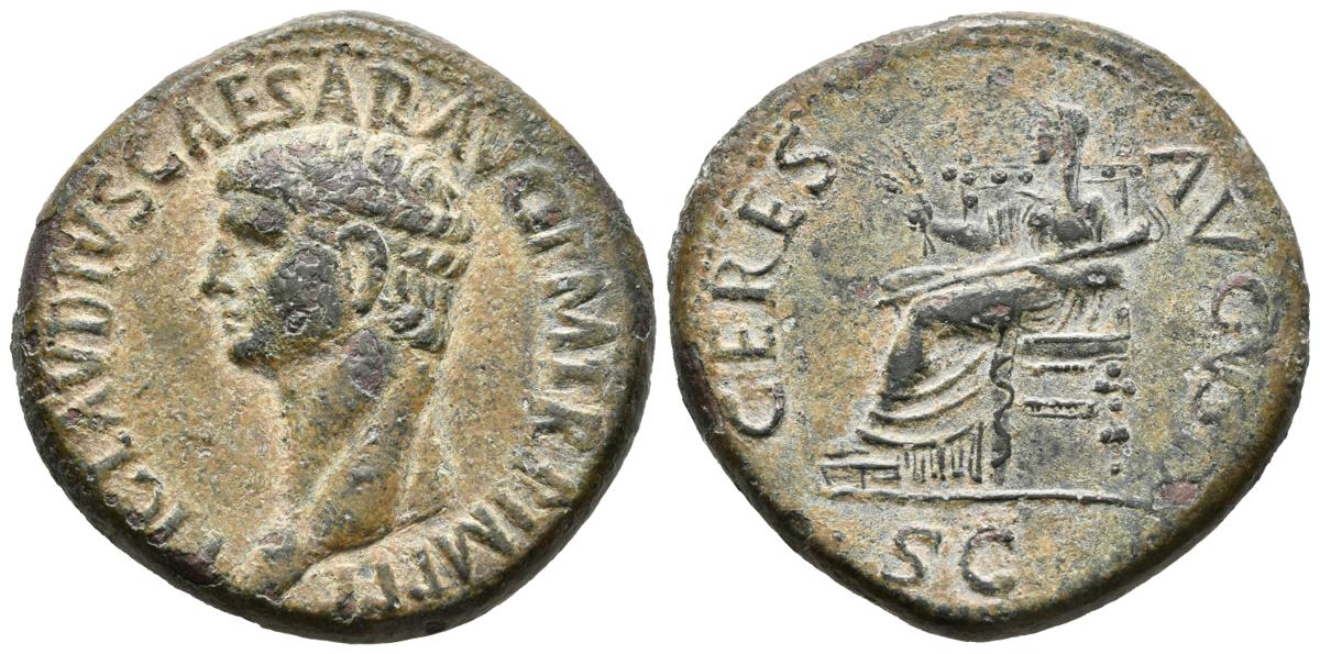 CLAUDIO. Dupondio. 41-50 a.C. Roma. A/ Busto a izquierda. TI CLAVDIVS CAESAR AVG P M TR P IMP. R/ Ceres velada y drapeada sedente a izquierda portando espiga con granos y antorcha larga. CERES AVGVSTA, en exergo SC. RIC 94. Ae. 15,70g. MBC+/EBC-.