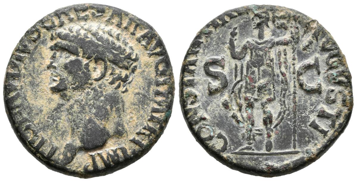 CLAUDIO. As. 50-54 d.C. Roma. A/ Cabeza a izquierda. TI CLAVDIVS CAESAR AVG P M TR P IMP P P. R/ Constantia estante a izquierda con atuendo militar, levantando su mano derecha y portando cetro largo, a los lados S C. CONSTANTIAE AVGVSTI. RIC 111. Ae. 11,28g. MBC/MBC+.
