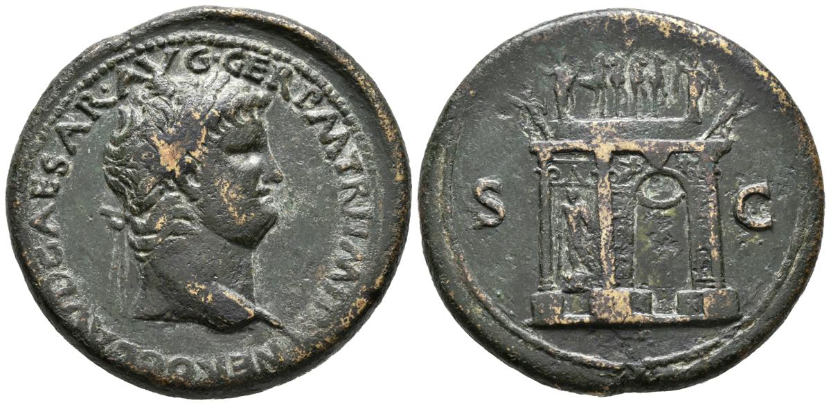 NERON. Sestercio. 65 d.C. Lugdunum. A/ Busto laureado a derecha. NERO CLAVD CAESAR AVG GER P M TR P IMP P P. R/ Arco triunfal, parte interior decorado con guirnalda de flores colgada, encima cuádriga guiada por el emperador acompañado de Pax y Victoria, flanqueado por dos soldados, en el altar lateral estatua de Marte; todos los laterales y base del arco están decorados con altosrelieves y escenas de batalla, a los lados S C. BMC 329. Cohen 307. RIC 392. Ae. 26,25g. MBC+.