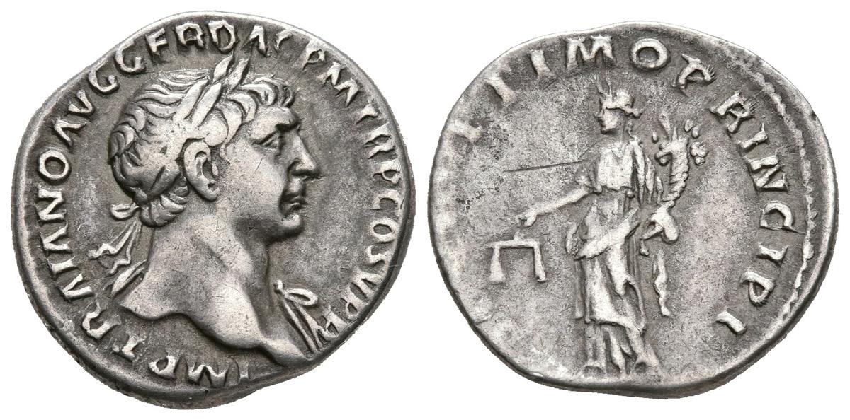 TRAJANO. Denario. 103-111 d.C. Roma. A/ Busto laureado a derecha con ligero drapeado sobre hombro izquierdo. IMP TRAIANO AVG GER DAC P M TR P COS V P P. R/ Aequitas estante a izquierda portando balanza y cornucopia. S P Q R OPTIMO PRINCIPI. RIC 169; BMC 167. Ar. 3,29g. MBC+/MBC.