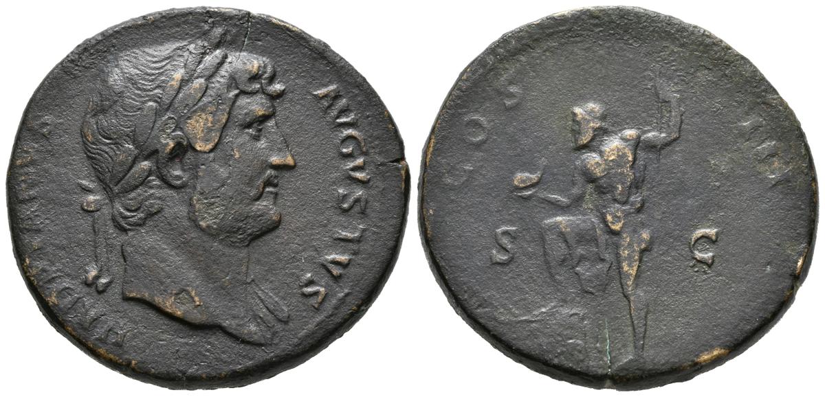 ADRIANO. Sestercio. 124-128 d.C. Roma. A/ Busto laureado a derecha. HADRIANVS AVGVSTVS. R/ Neptuno estante a izquierda con pie derecho apoyado sobre proa y portando acrostolium y tridente. COS III, a ambos lados S C. RIC 634. Ae. 25,80g. MBC.