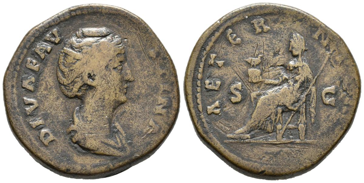 DIVA FAUSTINA I. Sestercio. 140-141 d.C. Roma. A/ Busto drapeado a derecha. DIVA FAVSTINA. R/ Aeternitas sedente a izquierda portando globo rematado con fénix y cetro. AETERNITAS, en exergo SC. RIC III 1103a. Ae. 26,70g. MBC-.