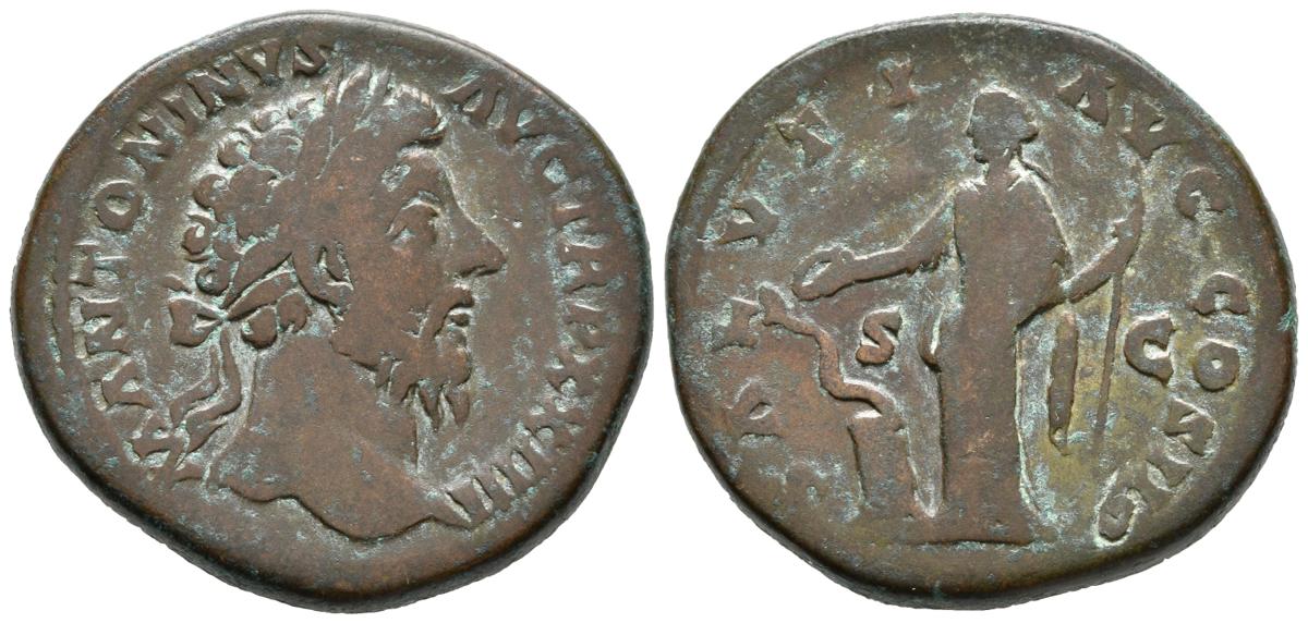 MARCO AURELIO. Sestercio. 161-180 d.C. Roma. A/ Busto laureado a derecha. M ANTONINVS AVG TR P XXIII. R/ Salus estante a izquierda portando cetro largo y alimentando serpiente sobre altar. SALVTI AVG COS III, a los lados S C. RIC 964; Cohen 544. Ae. 22,63g. MBC-/BC+.
