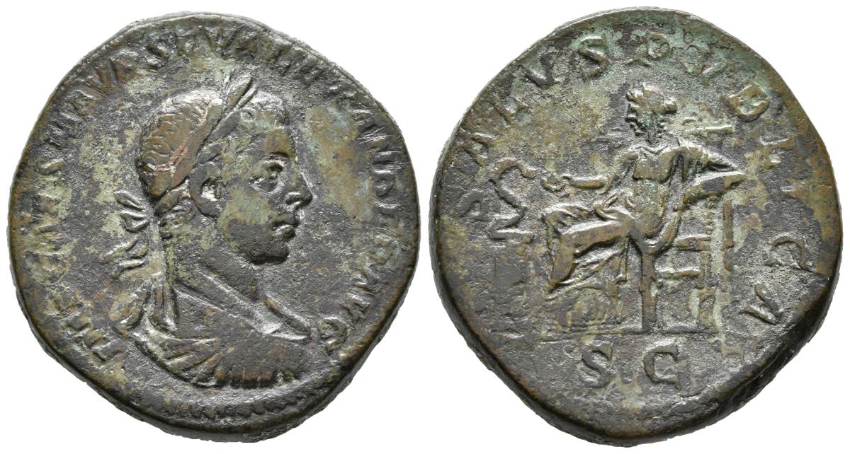 ALEJANDRO SEVERO. Sestercio. 221-223 d.C. Roma. A/ Busto laureado y drapeado con coraza a derecha. IMP CAES M AVR SEV ALEXANDER AVG. R/ Salus sedente a izquierda alimentando serpiente sobre altar. SALVS PVBLICA, en exergo S C. RIC 648. Ae. 22,15g. MBC-.