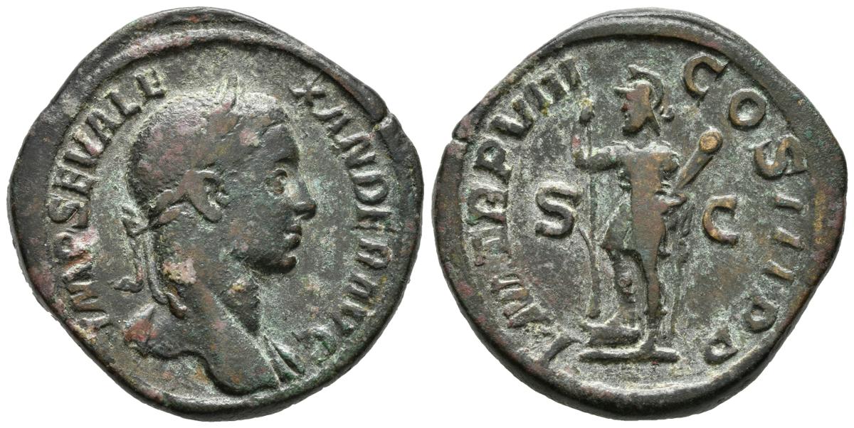 ALEJANDRO SEVERO. Sestercio. 222-235 d.C. Roma. A/ Busto laureado a derecha con ligero drapeado sobre hombro izquierdo. IMP SEV ALEXANDER AVG. R/ Virtus estante a izquierda apoyando pie sobre proa, portando lanza y parazonium. P M TR P VII COS II P P, a ambos lados S C. BMC 515; Cohen 344; RIC 477. Ae. 19,55g. MBC-.
