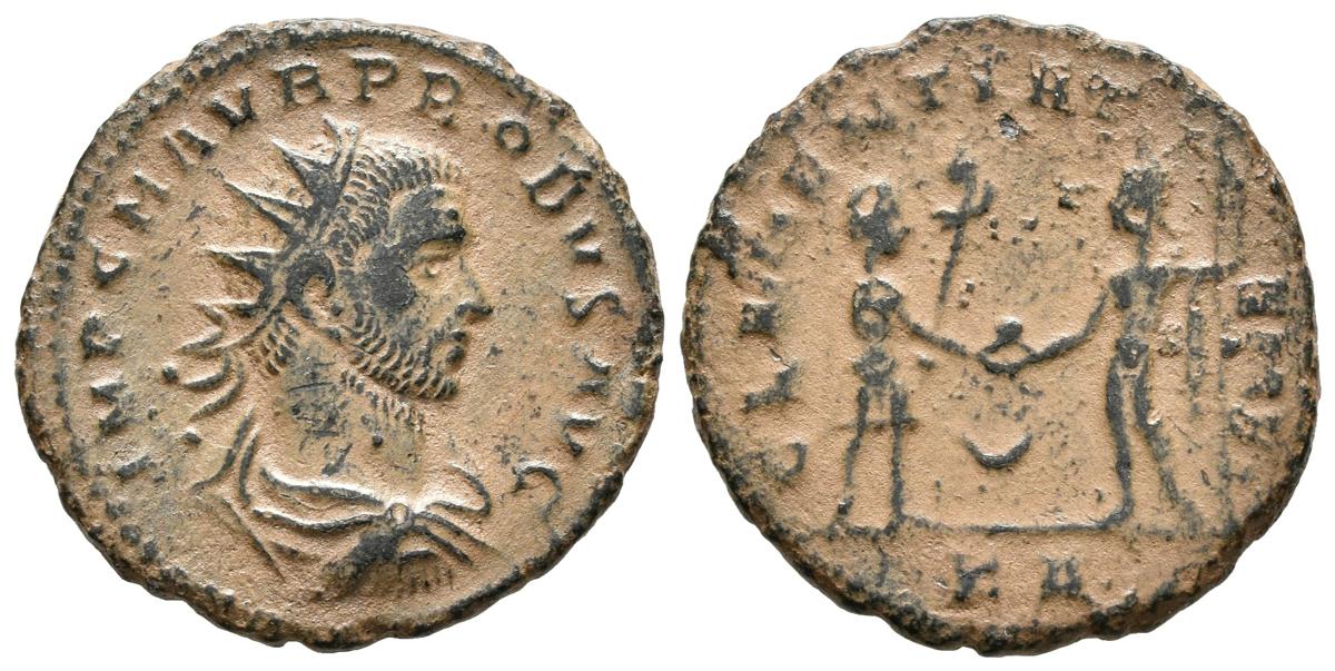 PROBO. Antoniniano. 276-282 d.C. Trípolis. A/ Busto radiado y drapeado con coraza a derecha. IMP C M AVR PROBVS P F AVG. R/ Emperador en pie a derecha portando lanza, frente a él Júpiter con cetro rematado en águila y entregándole globo, entre ellos creciente. CLEMENTIA TEMP, en exergo KA. RIC V 927. Ae. 4,08g. MBC+/MBC-.