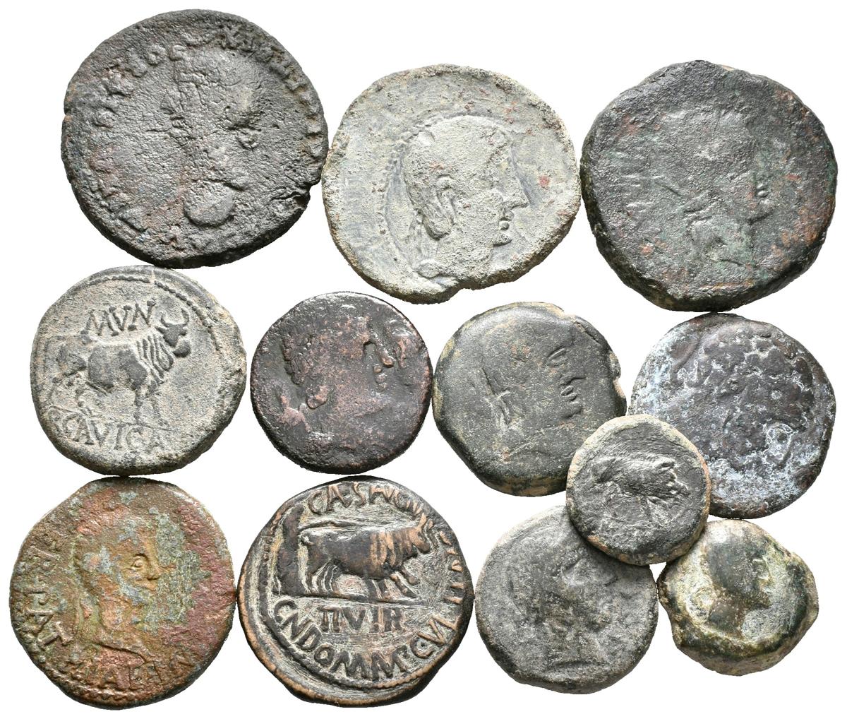 HISPANIA ANTIGUA. Lote compuesto por 12 bronces de las cecas: Arecoratas, Arsaos, Caesar Augusta, Calagurris, Cástulo, Colonia Rómula, Cunbaria, Ercavica, Icalcunscen y Sagunto. Ae. A EXAMINAR.