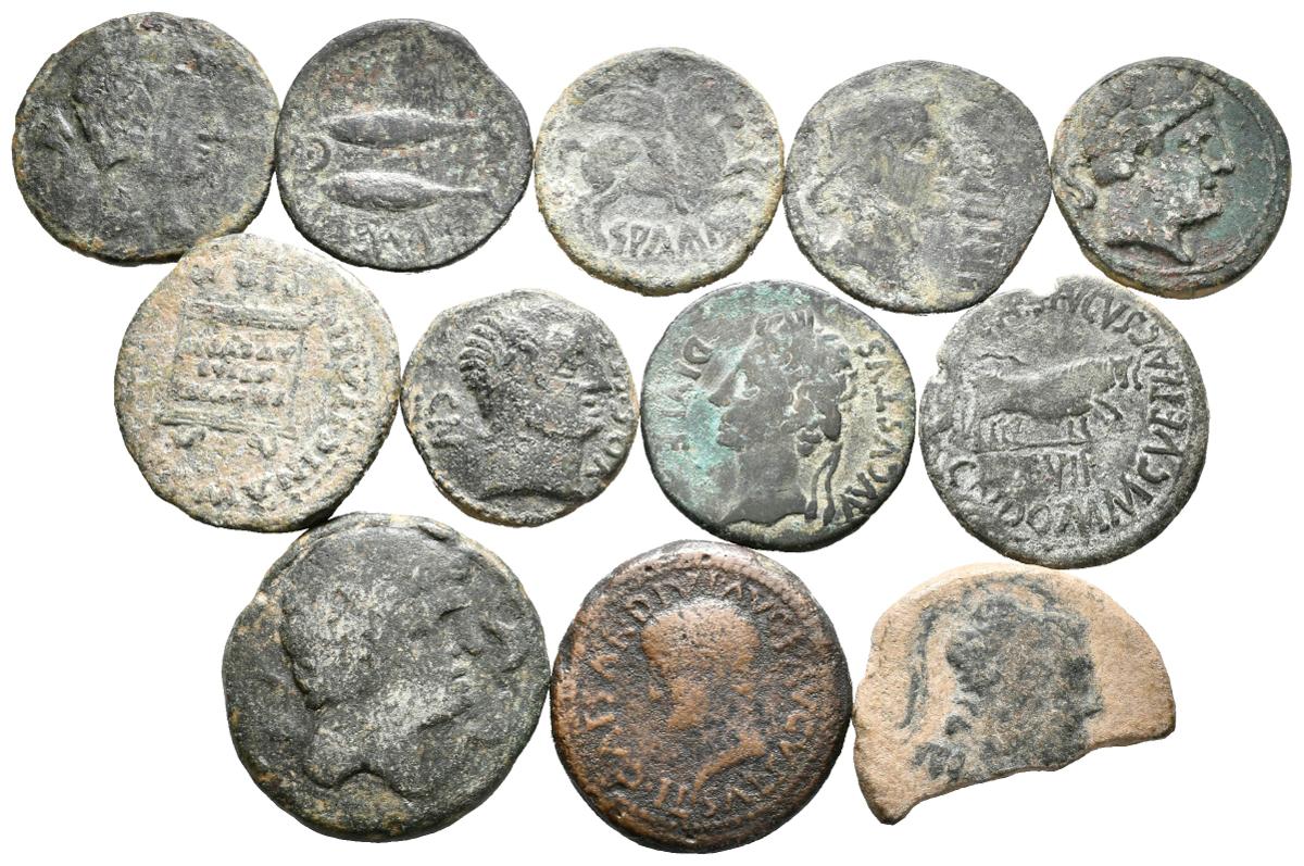 HISPANIA ANTIGUA. Lote compuesto por 12 bronces de las cecas: Acci, Bolscan, Caesar Augusta, Cástulo, Celse, Emporion, Gades, Icalcunscen, Irippo, Itálica y Salduie. Alguno fraccionado. Ae. A EXAMINAR.