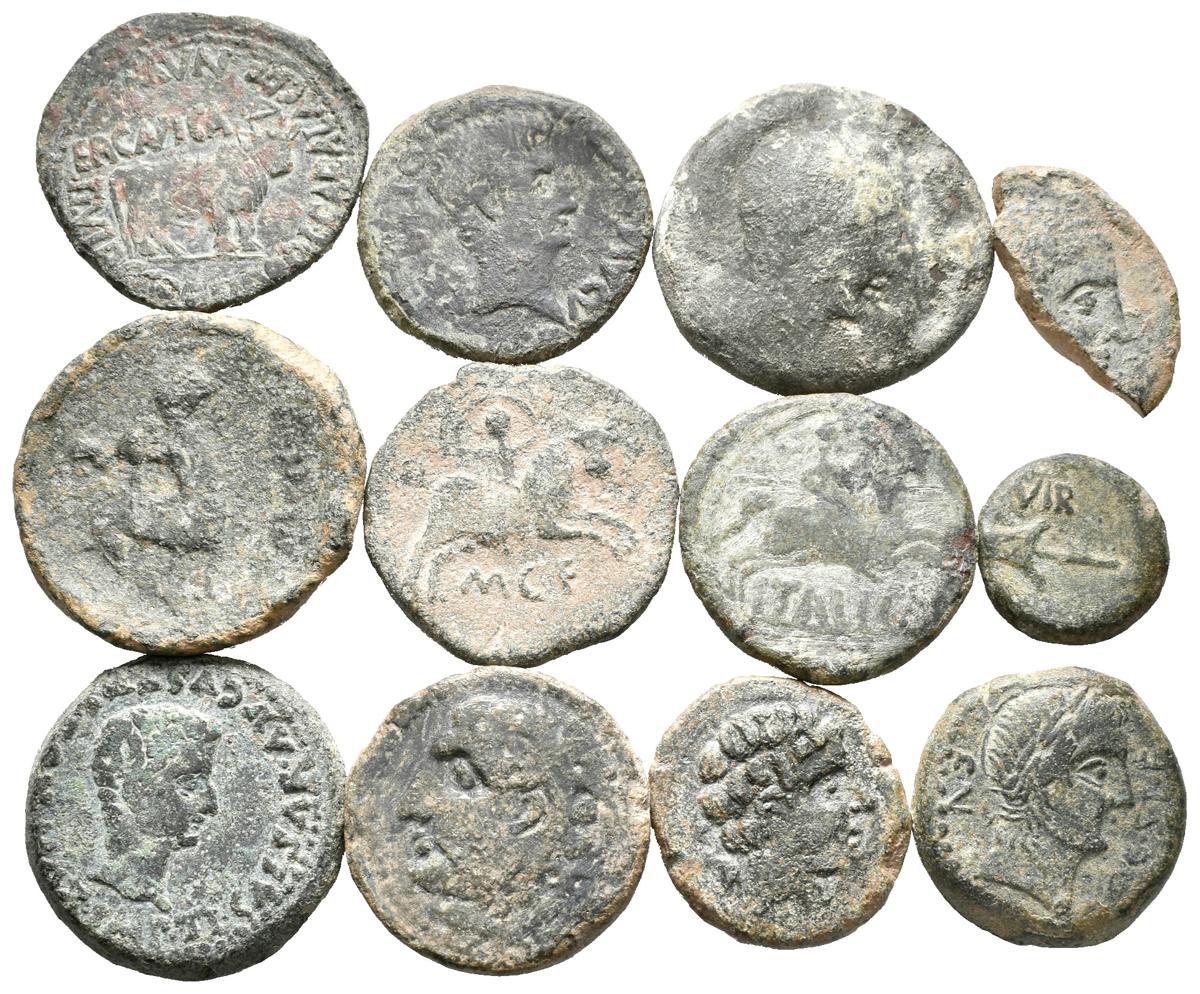 HISPANIA ANTIGUA. Lote compuesto por 12 bronces de las cecas: Bilbilis (Itálica), Bolscan, Cástulo, Emerita Augusta, Ercavica, Gades, Icalcunscen y Itálica.. Unas de las monedas fraccionadas. Ae. A EXAMINAR.