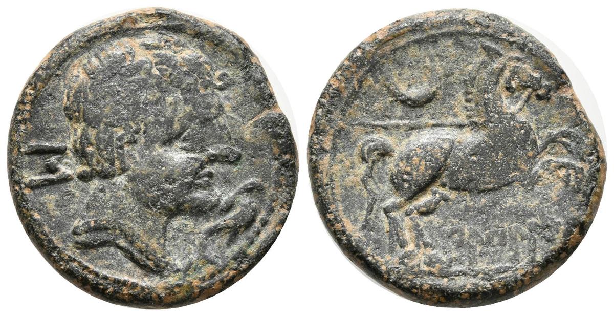 BILBILIS. Semis. 120-30 a.C. Calatayud (Zaragoza). A/ Cabeza masculina a derecha, delante delfín y detrás letra ibérica S. R/ Caballo saltando a rienda suelta a derecha, encima creciente, debajo BiLBiLIS. FAB-266. Ae. 7,37g. MBC-. Escasa.