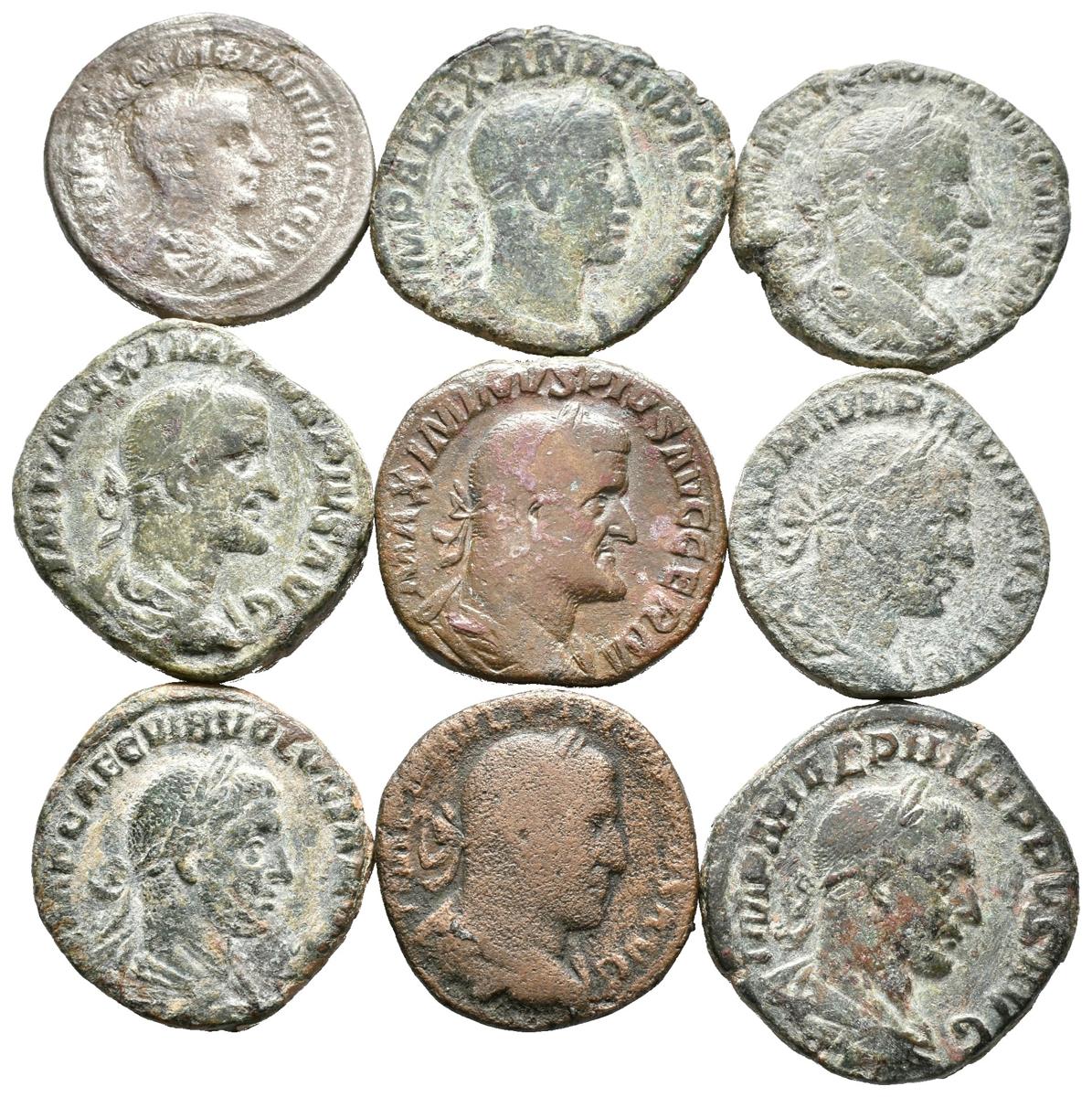 IMPERIO ROMANO. Lote compuesto 9 monedas: 8 Sestercios y Tetradracma de los emperadores Maximino, Filipo I, Treboniano Galo, Volusiano y Alejandro Severo. Ae/Ve. A EXAMINAR.