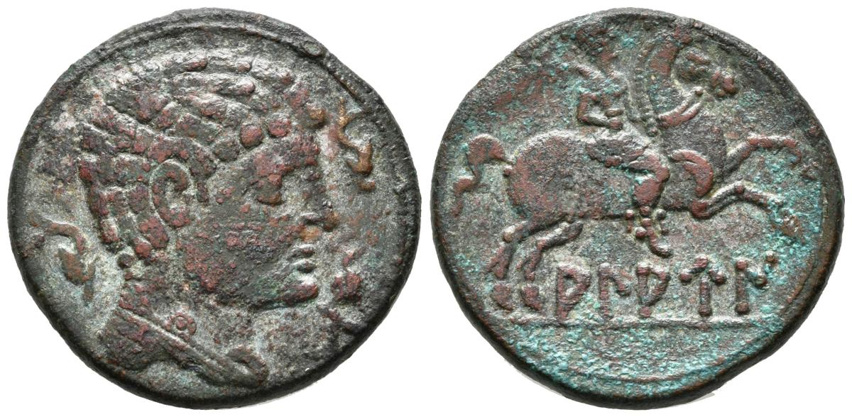 ALAUN. As. 120-80 a.C. Alagón (Zaragoza). A/ Cabeza masculina a derecha rodeada por tres delfines. R/ Jinete con palma a derecha, debajo sobre línea leyenda ALAUN. FAB-62. Ae. 11,85g. MBC+.