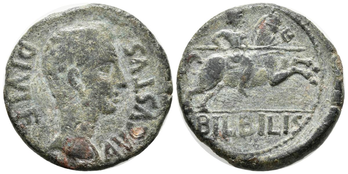 BILBILIS. As. Epoca de Augusto. 27 a.C.-14 d.C. Calatayud (Zaragoza). A/ Cabeza laureada a derecha. AVGVSTVS.DIVI.F. R/ Jinete con lanza a derecha, debajo BILBILIS. FAB-275. Ae. 12,66g. MBC/MBC+.