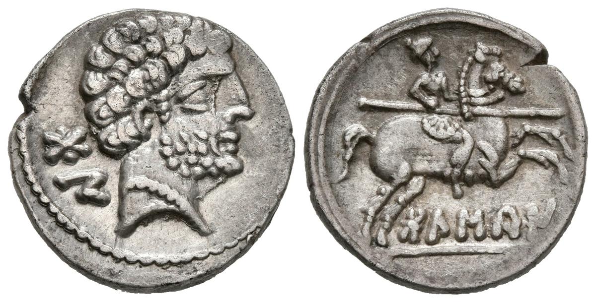 BOLSCAN. Denario. 180-20 a.C. Huesca. A/ Cabeza barbada a derecha, detrás letras ibéricas BoN. R/ Jinete con lanza a derecha, debajo leyenda ibérica. FAB-1911. Ar. 3,82g. EBC-.
