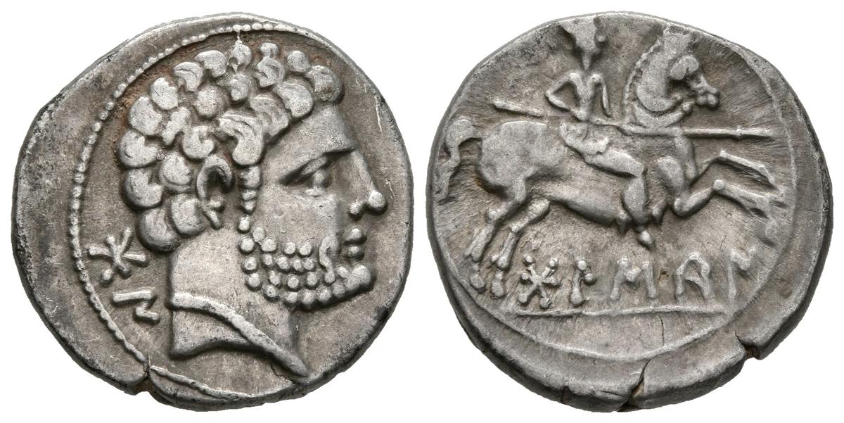 BOLSCAN. Denario. 180-20 a.C. Huesca. A/ Cabeza barbada a derecha, detrás letras ibéricas BoN. R/ Jinete con lanza a derecha, debajo leyenda ibérica. FAB-1911. Ar. 4,15g. MBC+.
