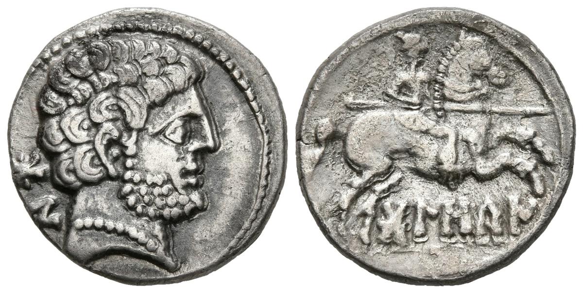 BOLSCAN. Denario. 180-20 a.C. Huesca. A/ Cabeza barbada a derecha, detrás letras ibéricas BoN. R/ Jinete con lanza a derecha, debajo leyenda ibérica. FAB-1911. Ar. 3,98g. MBC+/MBC.