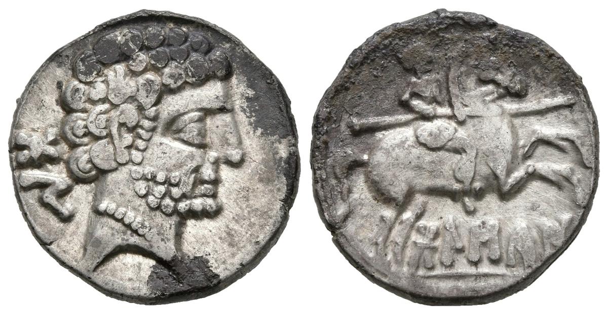 BOLSCAN. Denario. 180-20 a.C. Huesca. A/ Cabeza barbada a derecha, detrás letras ibéricas BoN. R/ Jinete con lanza a derecha, debajo leyenda ibérica. FAB-1911. Ar. 3,70g. MBC.