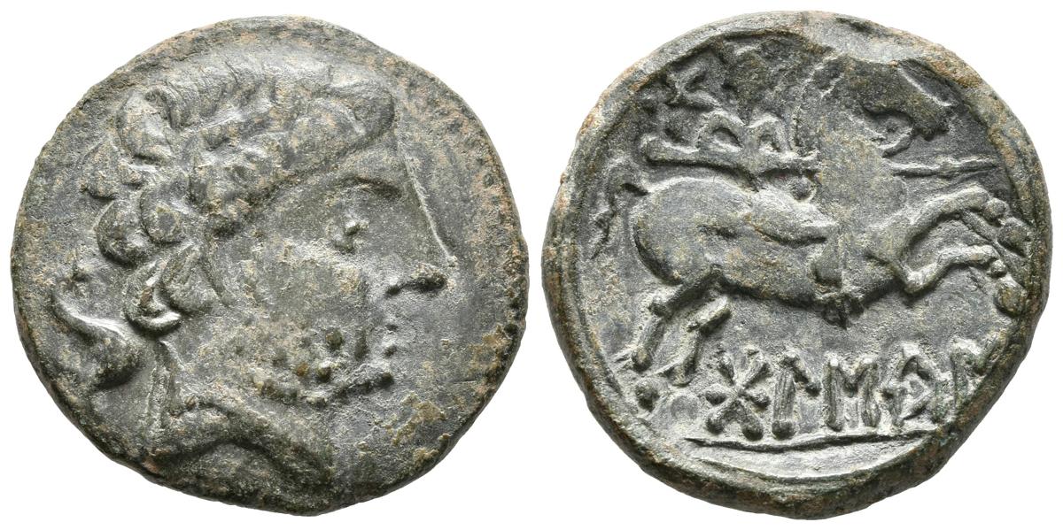 BOLSCAN. As. 180-20 a.C. Huesca. A/ Cabeza barbada a derecha, detrás delfín. R/ Jinete con lanza a derecha, encima estrella. FAB-1918. Ae. 8,77g. MBC+.