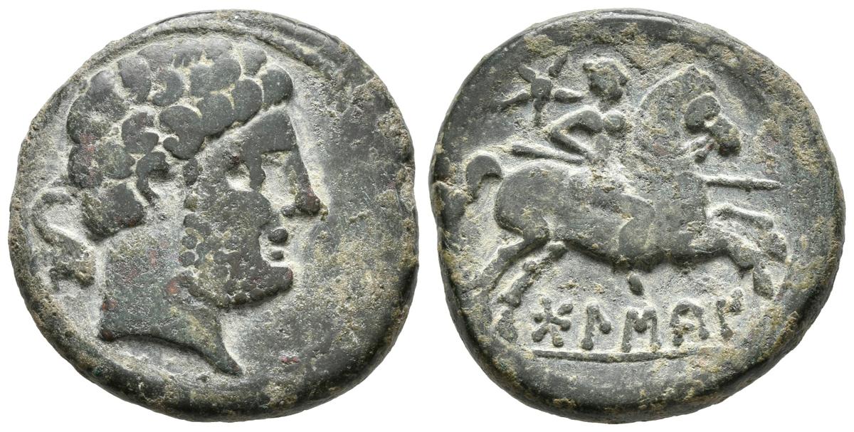 BOLSCAN. As. 180-20 a.C. Huesca. A/ Cabeza barbada a derecha, detrás delfín. R/ Jinete con lanza a derecha, encima estrella. FAB-1918. Ae. 10,61g. MBC/MBC+.