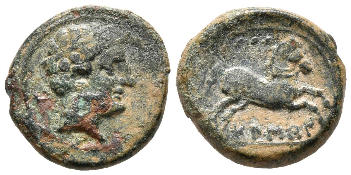 BOLSCAN. Cuadrante. 180-20 a.C. Huesca. A/ Cabeza diademada a derecha, detrás letra ibérica Bo. R/ Caballo saltando a derecha, encima tres puntos, detrás leyenda ibérica BoLSCaN. FAB-1922. Ae. 4,24g. MBC-/MBC.