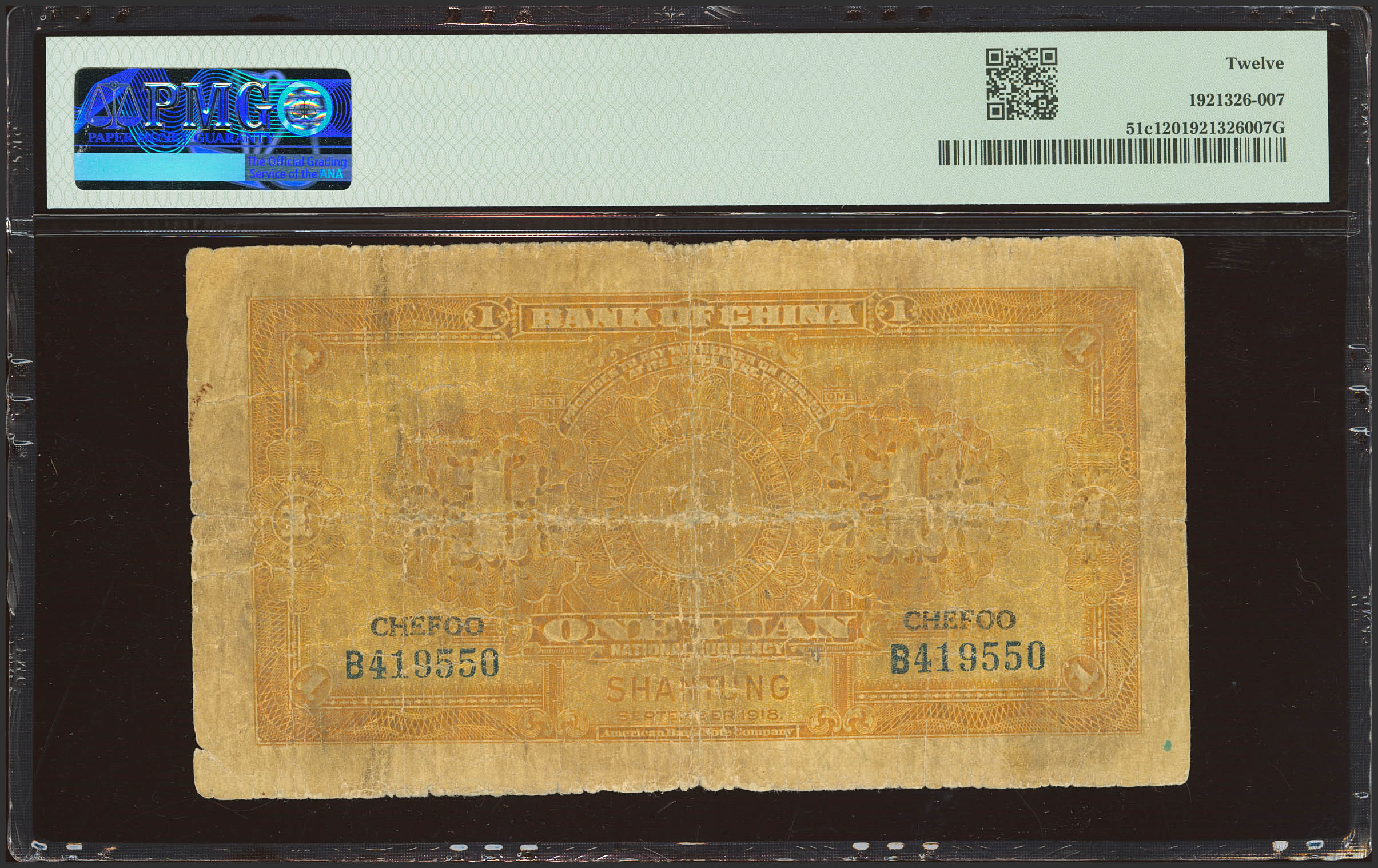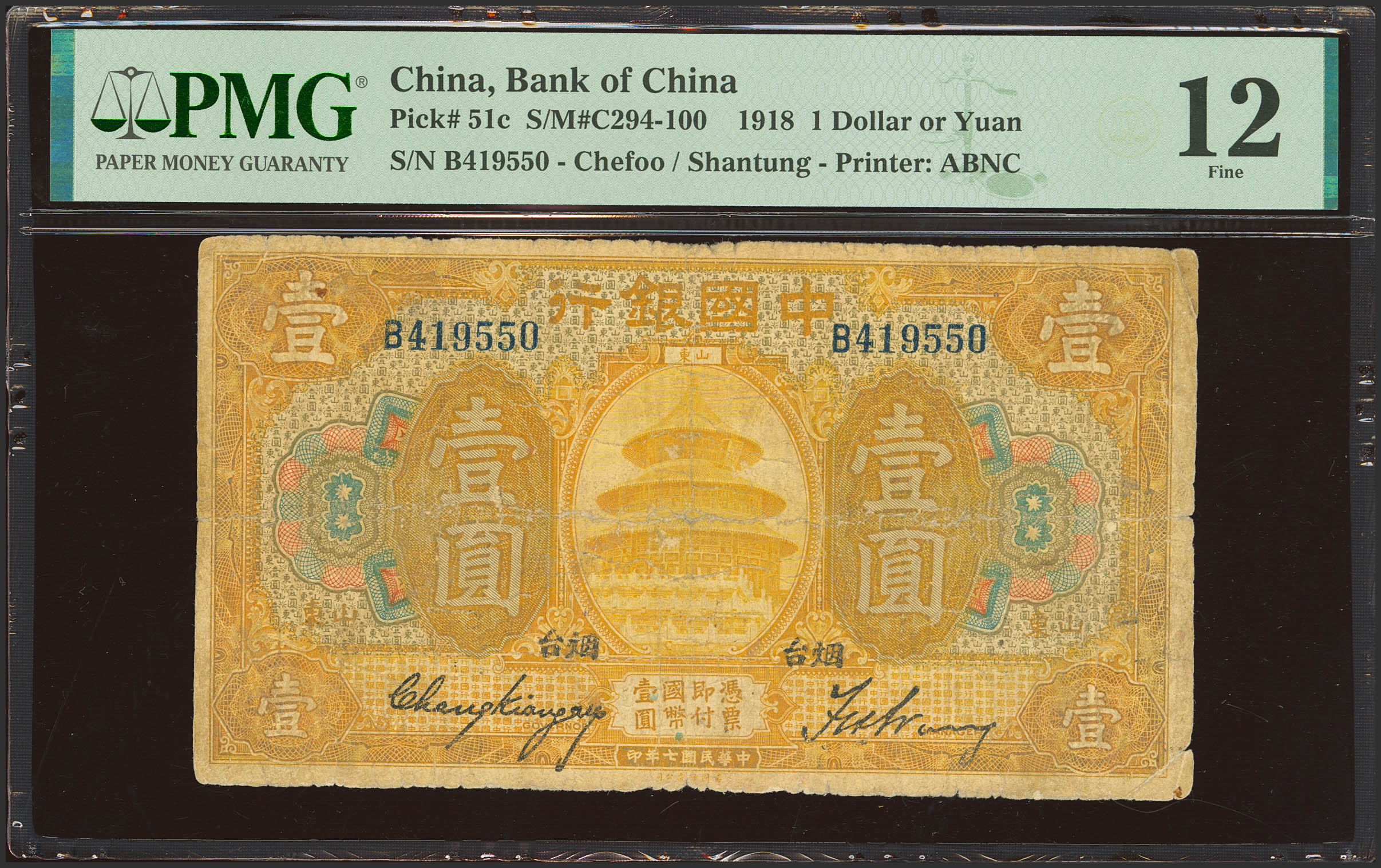 CHINA. 1 Yuan. September 1918. Bank of china. Chefoo / Shantung. (Pick: 51c, SM: C294-100). PMG12.