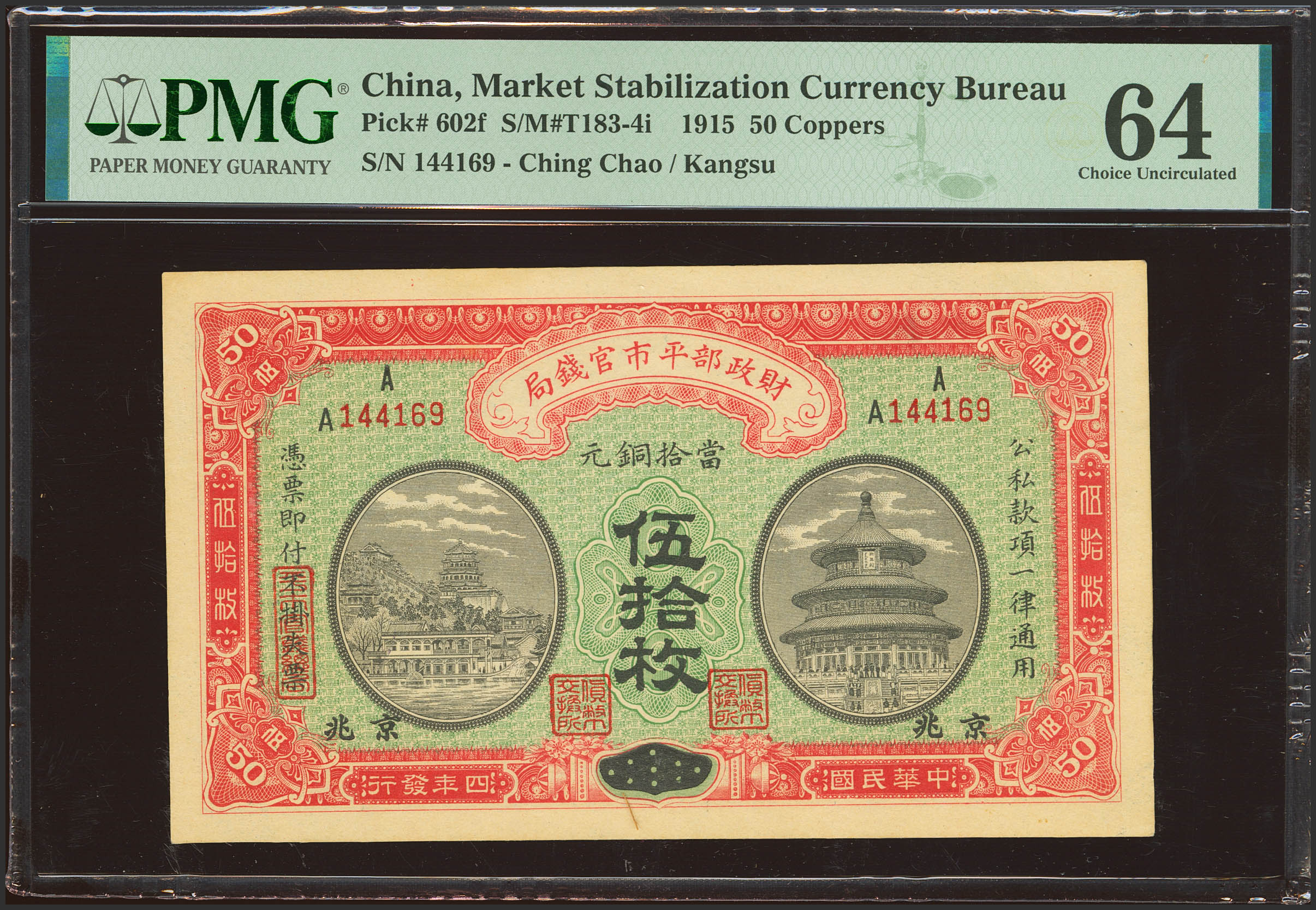 CHINA. 50 Coppers. 1915. Market Stabilization Currency Bureau. Ching Chao / Kiangsu. (Pick: 602f, SM: T183-4i). PMG64.