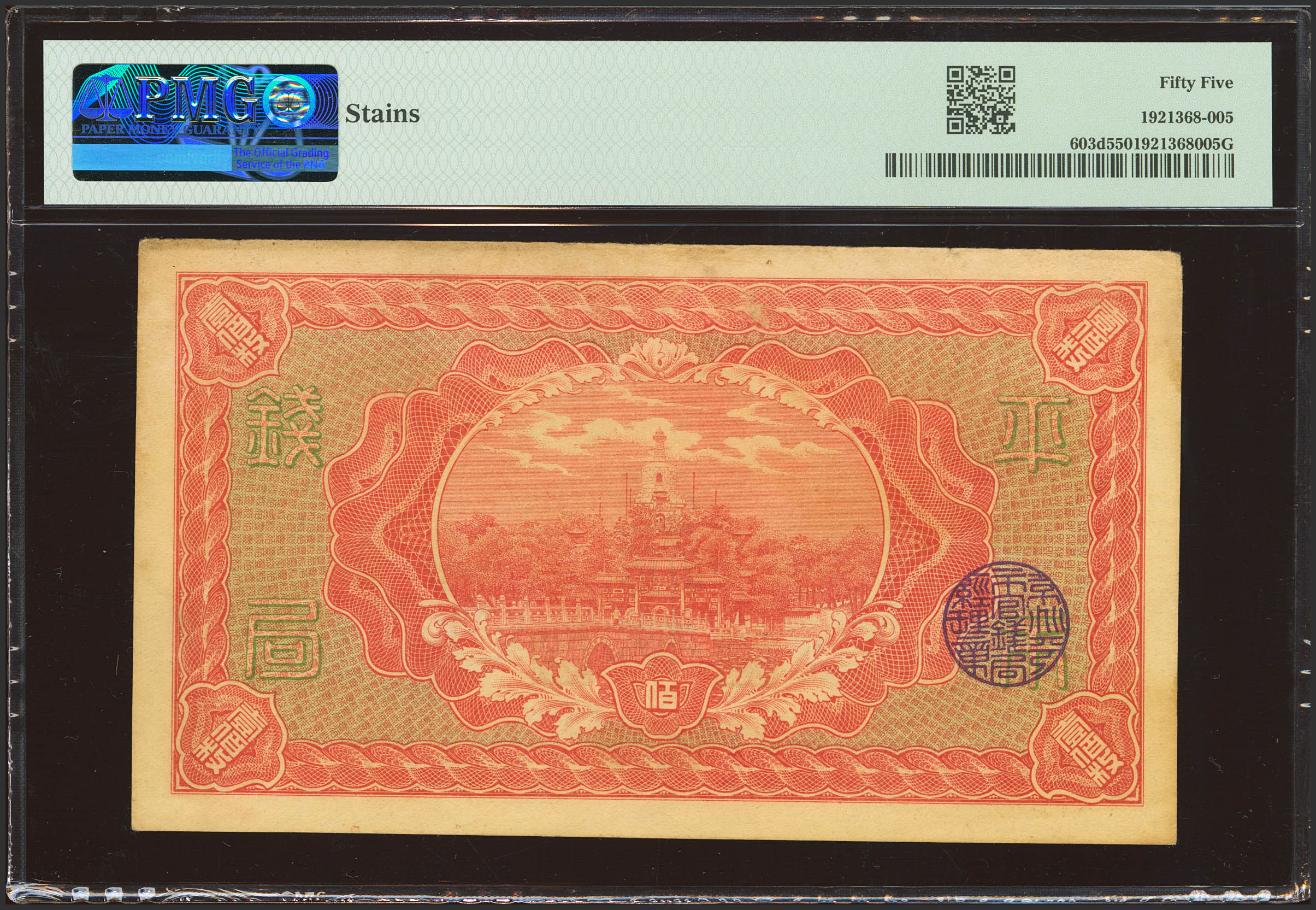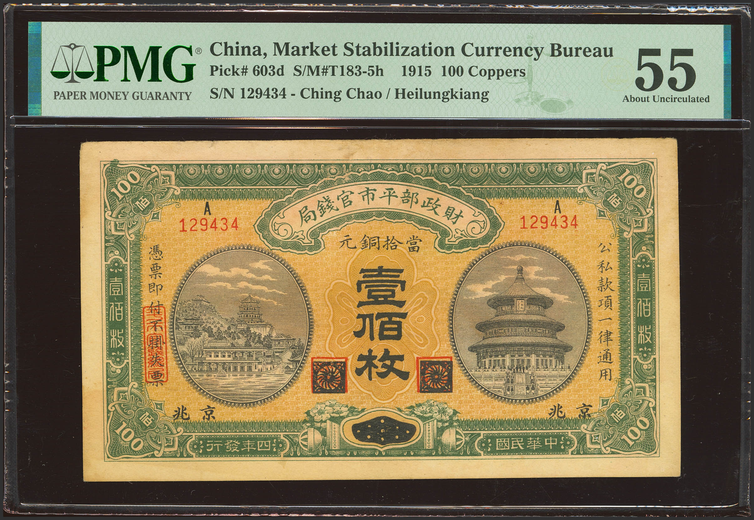 CHINA. 100 Coppers. 1915. Market Stabilization Currency Bureau. Ching Chao / Heilungkiang. (Pick: 603d, SM: T183-5h). PMG55 (stains).