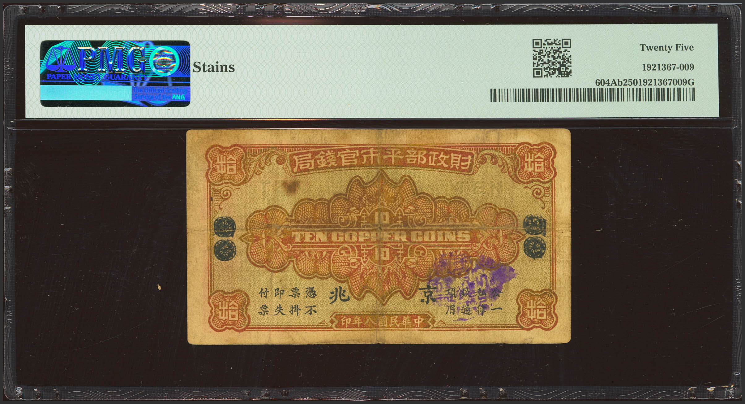 CHINA. 10 Coppers. 1919. Market Stabilization Currency Bureau. Ching Chao / Yen Tai. (Pick: 604b, SM: T183). PMG25 (stains).