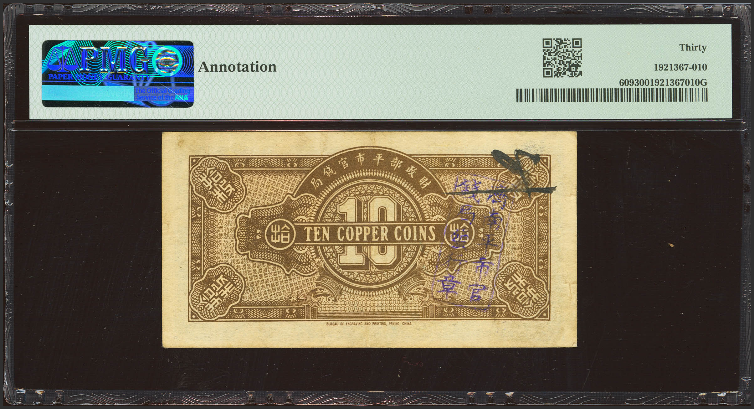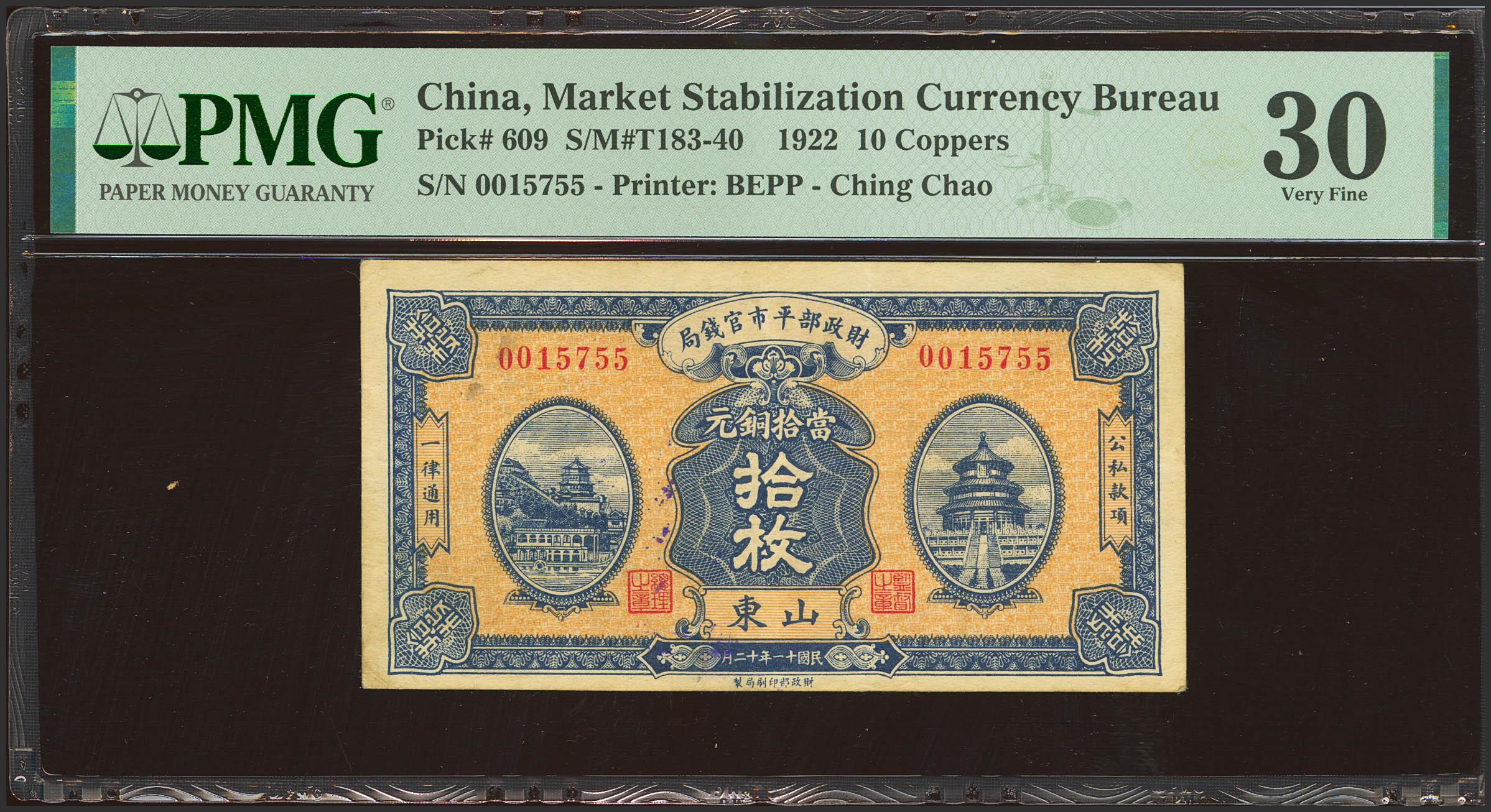 CHINA. 10 Coppers. 1922. Market Stabilization Currency Bureau. Shantung. (Pick: 609, SM: T183-40). PMG30 (annotation).