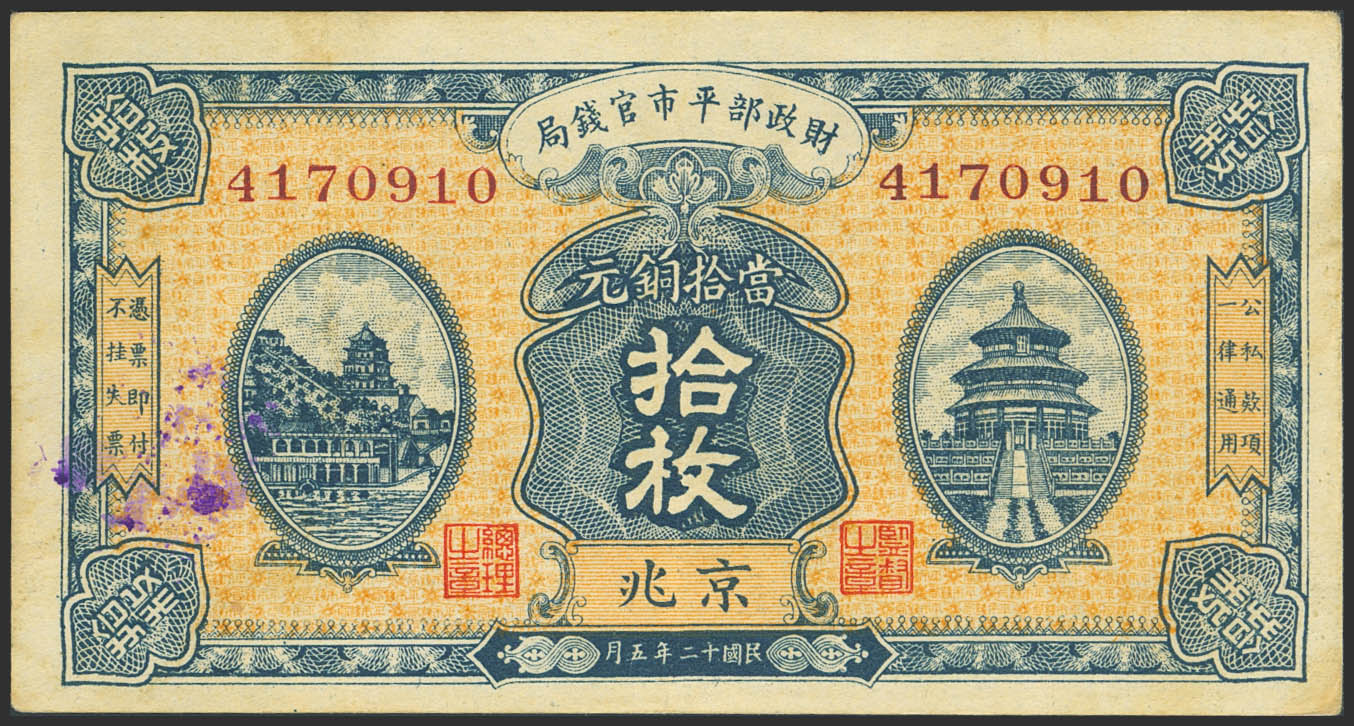 CHINA. 10 Coppers. 1923. Market Stabilization Currency Bureau. Ching Chao. (Pick: 612a). Extremely Fine.