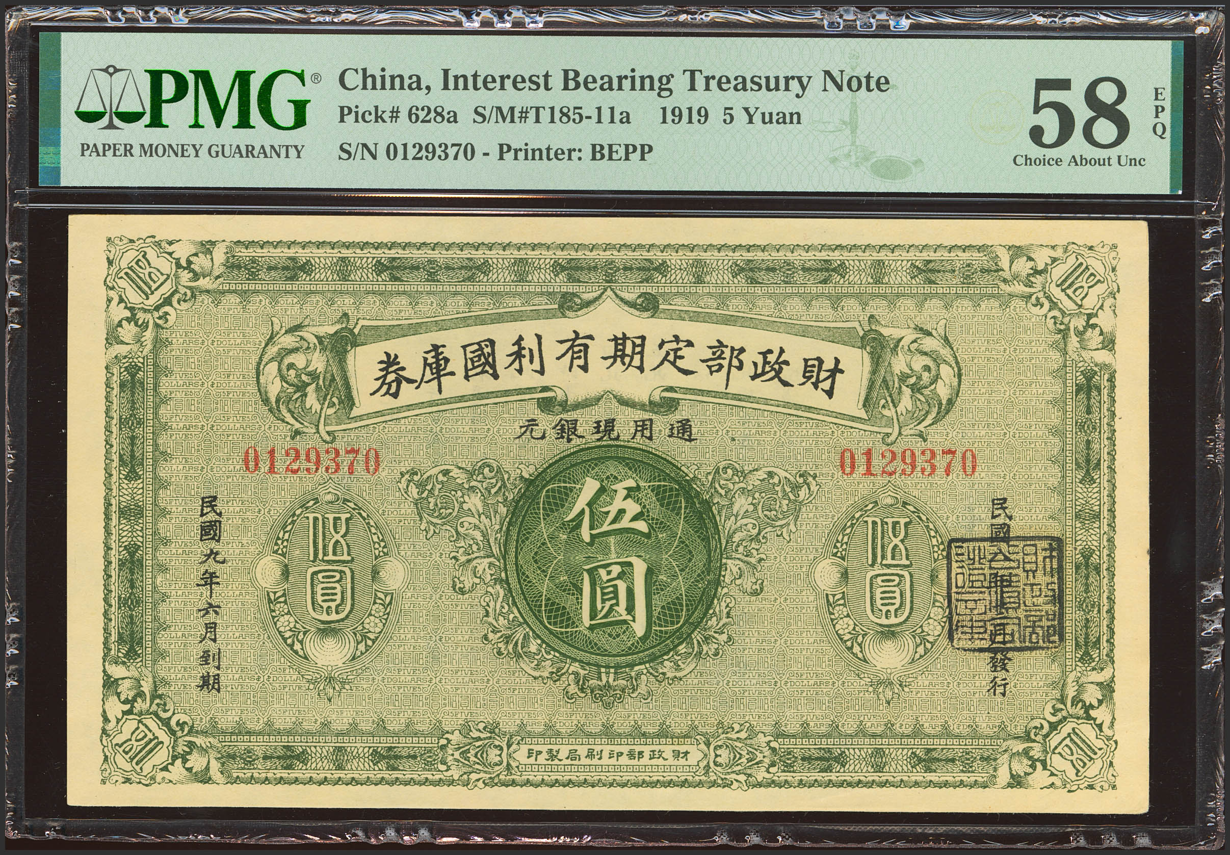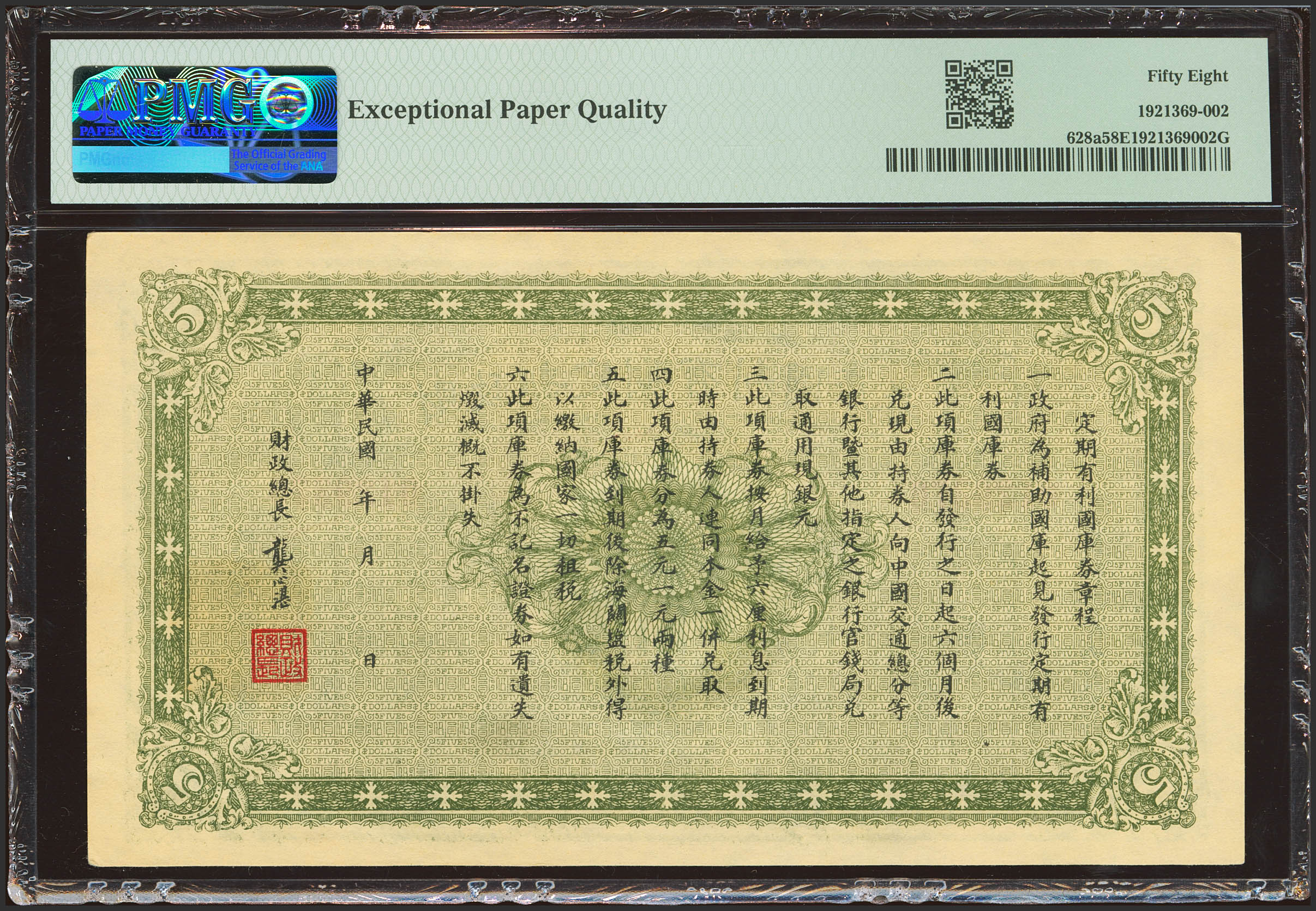 CHINA. 5 Yuan. 1920. Fixed Term Interest Bearing Treasury Note. (Pick: 628b, SM: T185-11a). PMG58EPQ.