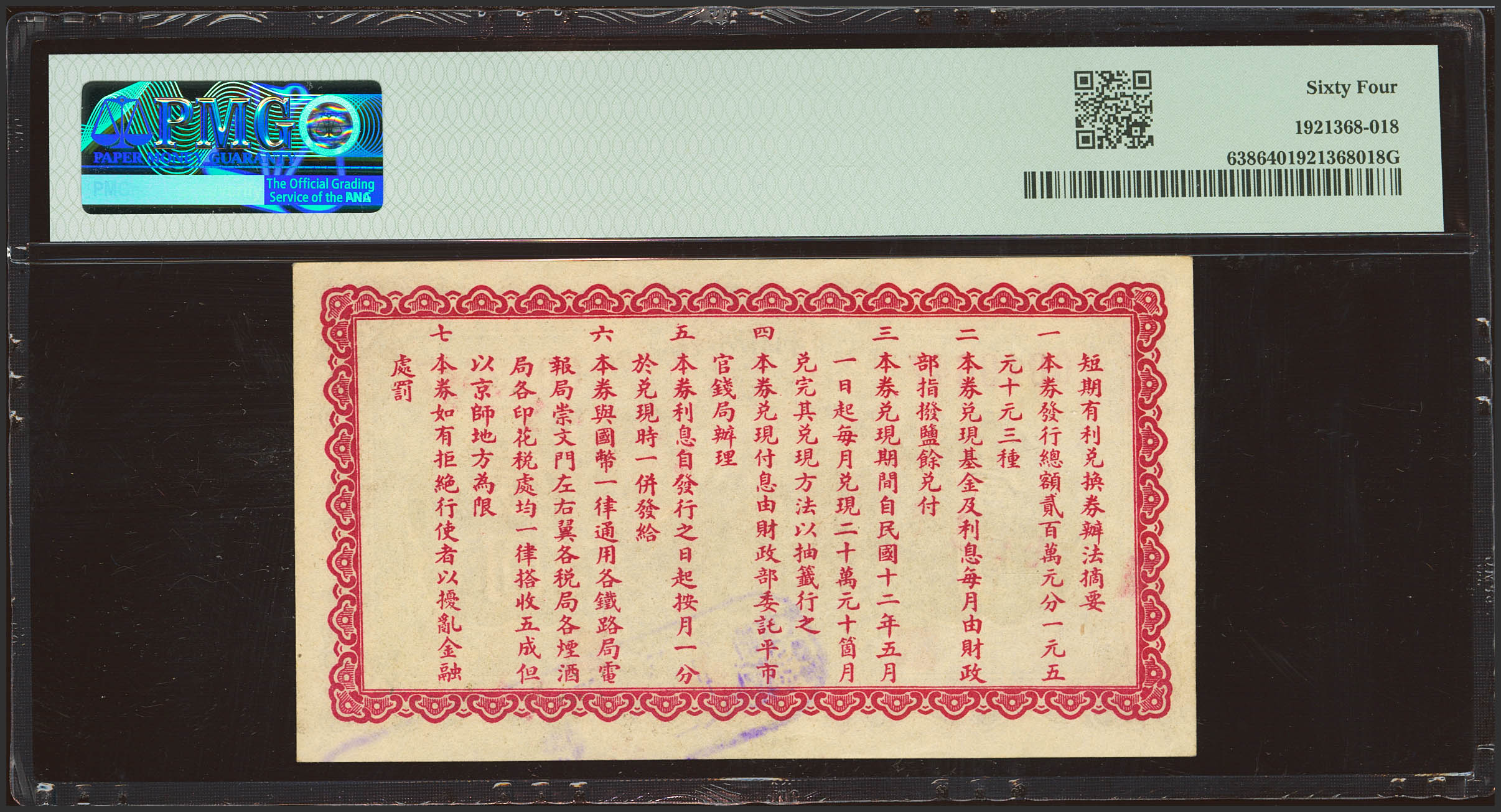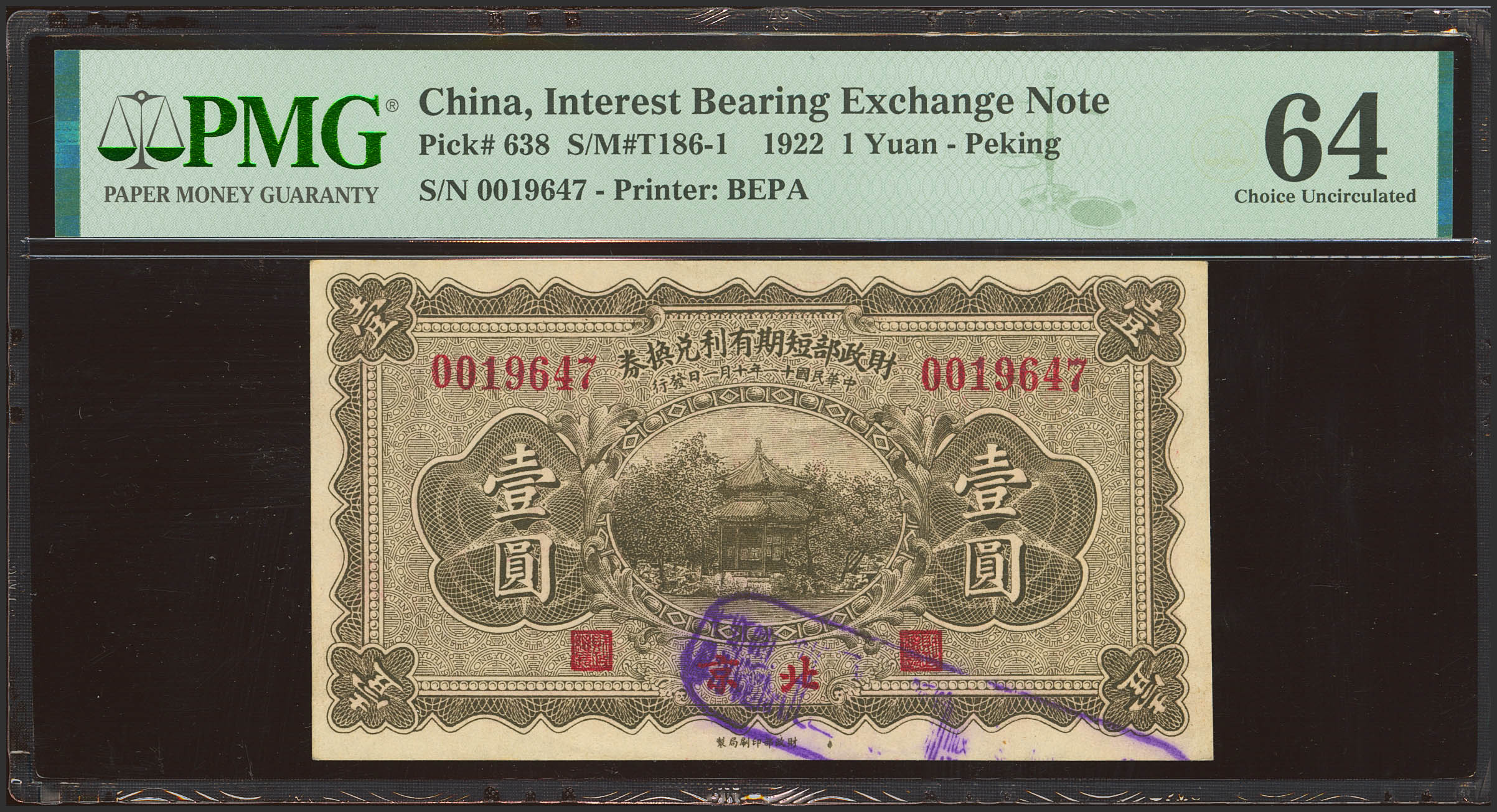 CHINA. 1 Yuan. 1922. Short Term Interest Bearing Exchange Note. (Pick: 638, SM: T186-1). PMG64.